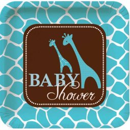 These Wild Safari Blue Dinner Plates feature a cute blue and brown baby shower design.