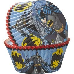 These Batman Baking Cups are printed with a comic-book-style Batman all around with Bat-Signal detailing. They're a fun way to make your cupcakes match your Batman birthday decor! Also great for serving nuts and candy.