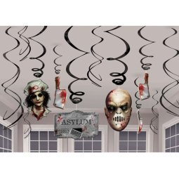 Pack of 12 Halloween Mental Asylum hanging swirl decorations.