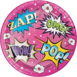 Serve up your treats on these expressive Girl Superhero Dessert Plates. These pink paper plates measure 17cm round and display several superhero sound effects such as "Wow!", "Zap!", "OMG!" and "Pow!". The Sturdy Style plate can be combined with other Girl Superhero party supplies.