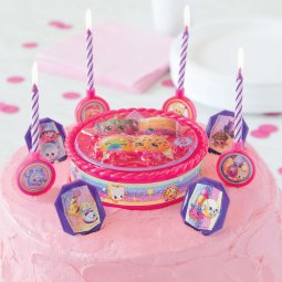 Use our Shopkins cake decoration kit to make your birthday cake look even sweeter! this all-in-one cake decorating kit comes with 1 cake topper, 8 birthday candles, 4 candle holders, and 4 plastic rings, so you'll have plenty of decorations to top off your birthday treat. Place the plastic Shopkins cake topper in the center of your birthday cake and surround it with the striped purple candles. Use our cute Shopkins candle holders to keep wax from dribbling onto your cake. Finally, finish it off by arranging the plastic rings around the top of your treat. Just give the rings a wash when everyone's done eating, and little Shoppies can wear them home! shop the rest of our Shopkins party supplies and get little girls ready to shop 'til they drop!