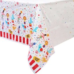 One 1.37m x 2.13m plastic Circus Carnival Table Cover. This table cover will set the stage for The Greatest Party on Earth! Just unfold, add coordinating tableware, and finish up with some cutlery and centerpieces. Our Circus Carnival Table Cover also makes clean-up a breeze. Gather disposables on top, wrap everything up, and toss it into the trash or recycling bin!