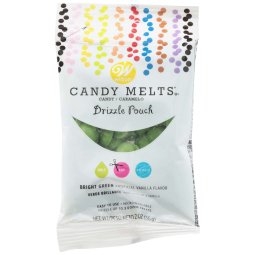 Convenient drizzle pouch lets you add some sweet candy flavor to treats. Just microwave the pouch until candy is melted, then cut the pouch and drizzle bright green Candy Melts candy over pretzels, fruit or other sweet treats.
