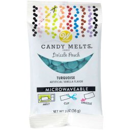 Convenient drizzle pouch lets you add some sweet candy flavor to treats. Just microwave the pouch until candy is melted, then cut the pouch and drizzle Turquoise Candy Melts candy over pretzels, fruit or other sweet treats.