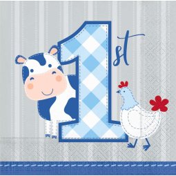 Pack of 16, Blue Farmhouse 1st Birthday Small Napkins.