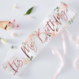 The birthday boy or girl will feel like a winner when you give them a Ginger Ray Floral Birthday Sash! This white paper sash features a metallic rose gold "It's My Birthday" headline printed on it with pink floral designs. You can give this birthday sash to the guest of honor to accessorize their birthday outfit!