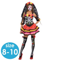 Day of the Dead Señorita Costume features a black lace veil with a crown of flowers on a plastic headband and a lace choker with an attached flower and skull charm, this costume is sure to turn some skulls. The colourful dress has a skeleton print bodice and a flouncy mini skirt embellished with tiered layers of lace-trimmed fabric in red, yellow and pink. Top off your fantastic outfit with lace sleevelets and skeleton print thigh highs, each adorned with flowers and ribbon.