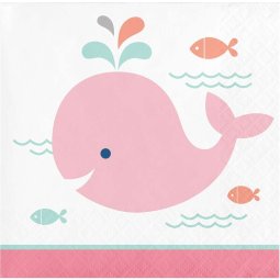 These small paper napkins feature a smiling pink whale, gray, orange, and teal fish, and pink and teal stripes bordering the white background. These beverage napkins are perfect to use at your whale baby shower or gender-neutral baby shower. Place Pink Baby Whale Beverage Napkins on the cake table to add a sweet touch to the party tableware.