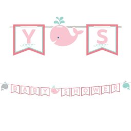 Whale-come guests to a party with porpoise using a Pink Baby Whale Baby Shower Pennant Banner. This banner features 10 white cutouts that are ribbon shaped and spell out ""Baby Shower"" in light pink letters, along with smiling whale cutouts in pink. The cardstock cutouts are strung together with white ribbon, so the banner can be hung in a door frame or above the cake table. Hang up a Pink Baby Whale Baby Shower Pennant Banner at your whale baby shower for a party decoration that will make a splash!